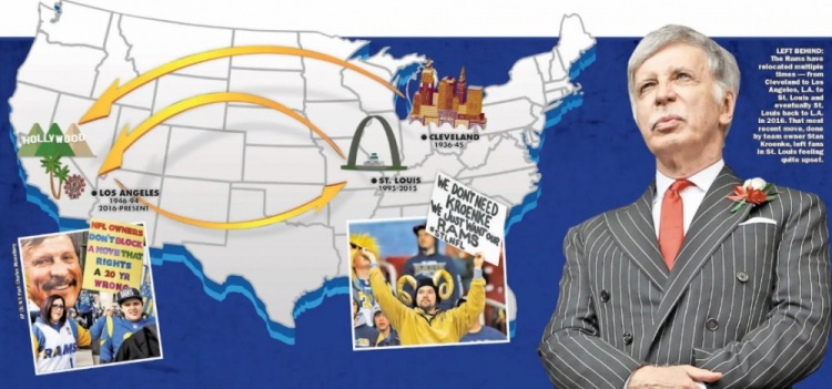 NFL当然愿意极力促成公羊重回洛杉矶,2016年初以30-2的表决通过了这一决定。至此,克伦克成为圣路易斯公敌,当地市政府也把他和NFL告上法庭,最终胜诉获得7.9亿美元赔偿,其中三分之一都要由NFL其他老板承担。