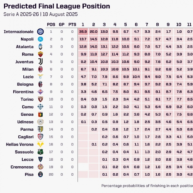 8月21日讯 opta通过超级计算机预测本赛季意甲排名,国米有35.9%的概率夺冠,在夺冠概率上那不勒斯、亚特兰大分列二三位。